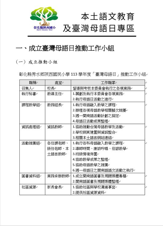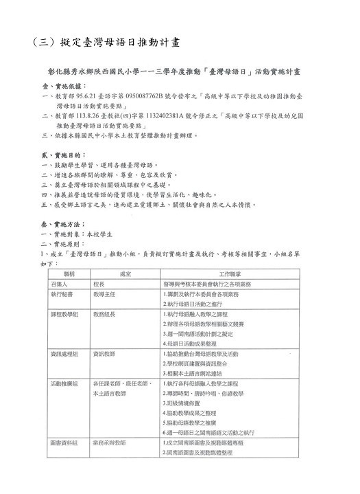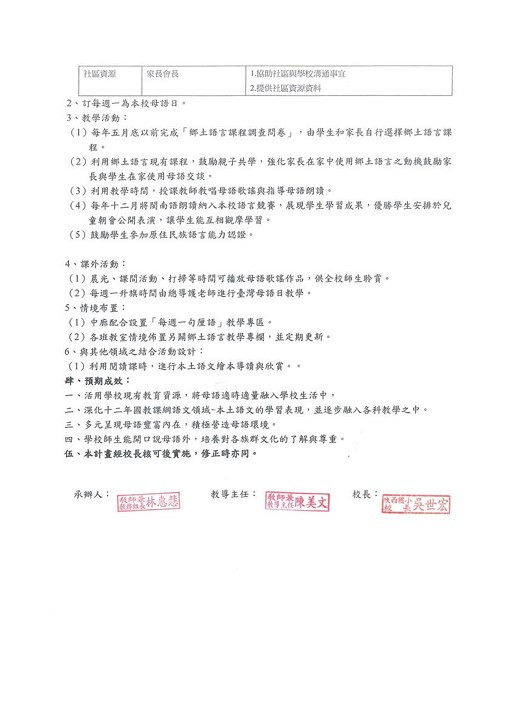 落實學校之課程目標及精神,鼓勵學生學習、運用各種臺灣母語,增進各族群間的瞭解、尊重、包容及欣賞,奠立臺灣母語於相關領域課程中之基礎,推展並營造臺灣母語優質環境。
