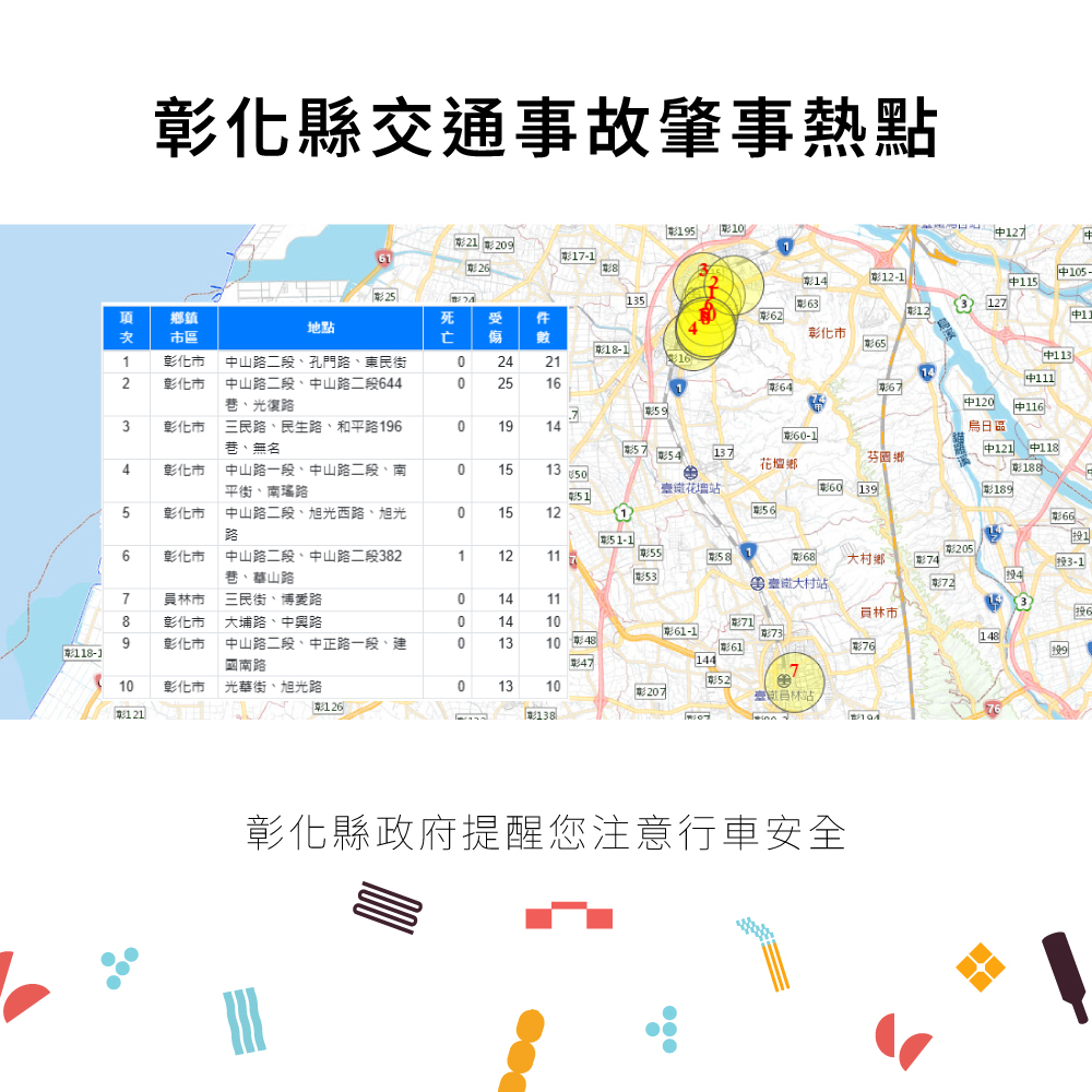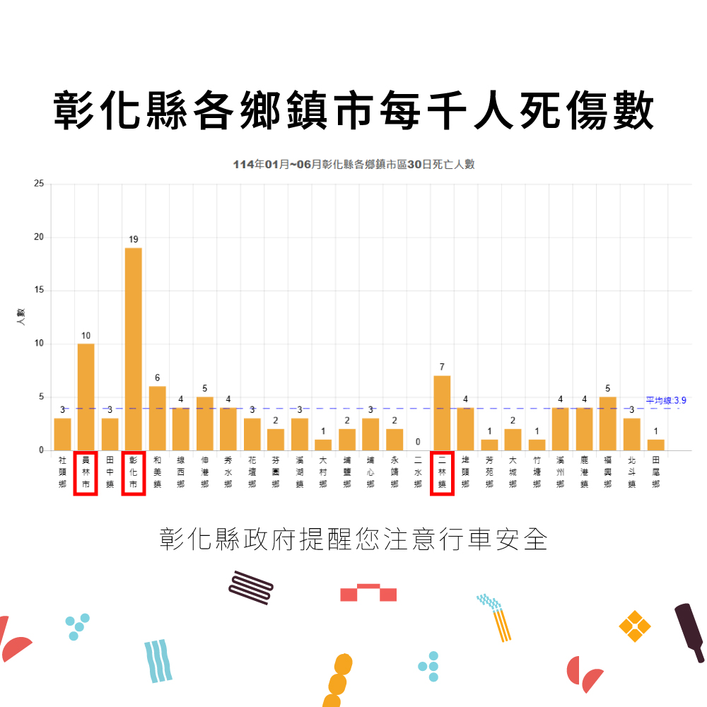 二、根據交通部道安資訊查詢網統計快覽數據跟112年同期比較 分析,以少年自行車騎士(含電自、電輔) 事故增加47.7% 最高,外籍人士事故增加38.6%次之,自小客車駕駛人增加25.4%再次之。1-6月份30日鄉鎮市每千人死傷人數於「彰化市、員林市、二林鎮」為多,肇事熱點以「彰化市」為 多,合先敘明。