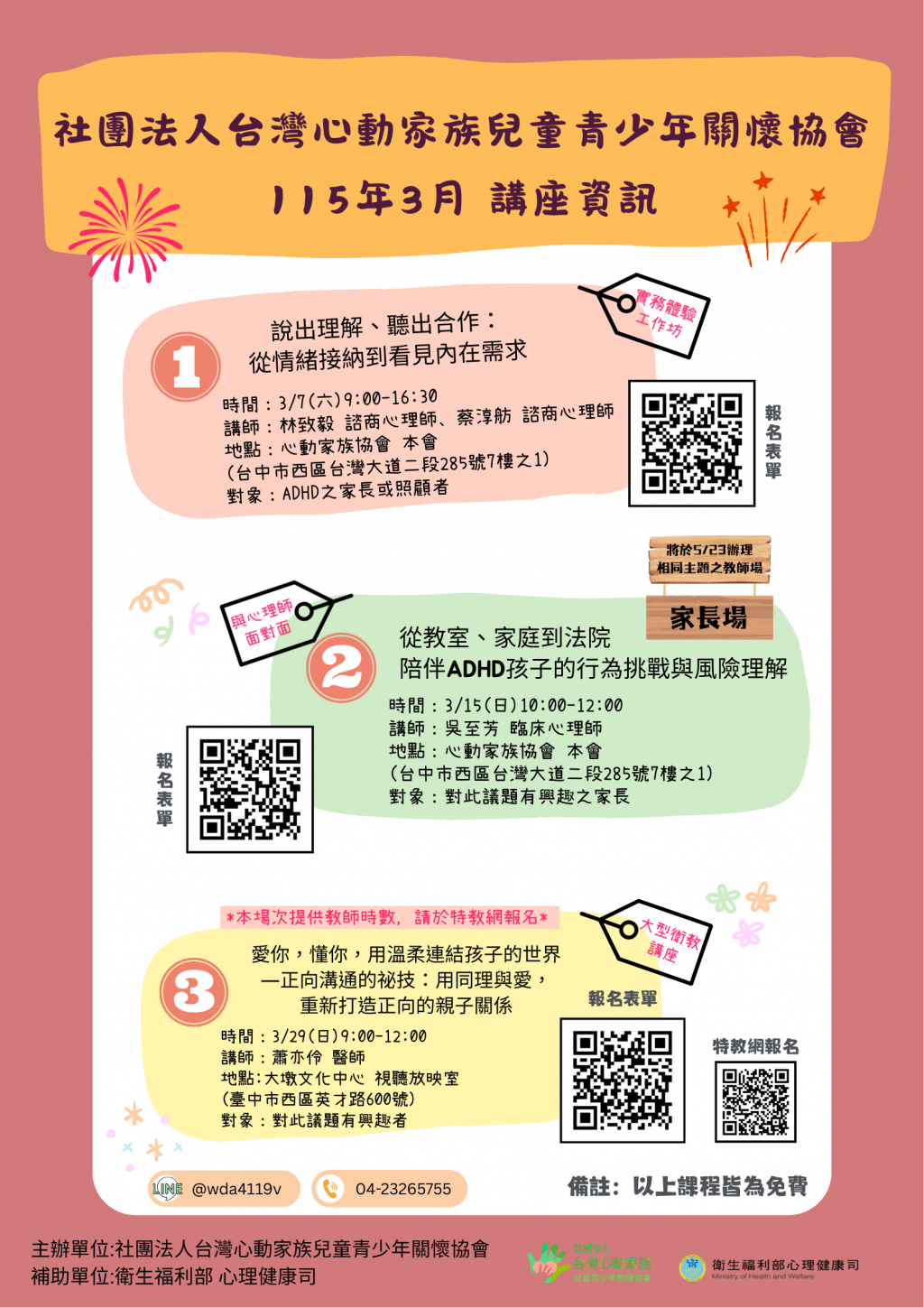 | 一、 | 社團法人台灣心動家族兒童青少年關懷協會長期關注注意力不足過動症(ADHD)兒童青少年之心理健康與人際適應議題,規劃辦理一系列免費之教師研習及家長教育活動。 |