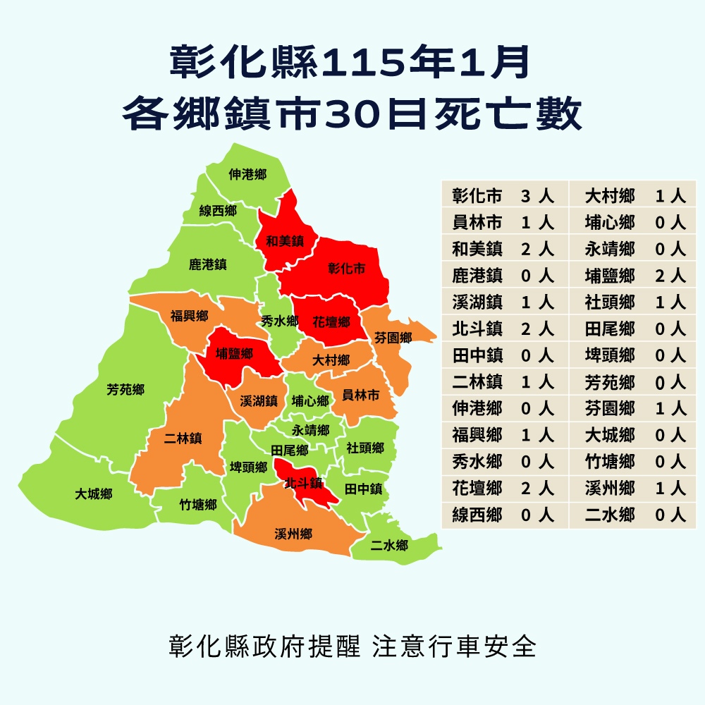 附件為「115年1月彰化縣交通事故死傷人數增加排行、本縣各鄉鎮市30日死亡人數、各運具交通事故肇因及肇事熱點」共5份統計資料宣導圖,社群宣導內容可參閱或分享本處「花現彰化-彰化縣政府新聞處」(https://pse.is/8xjc2f)臉書粉絲專頁。 |