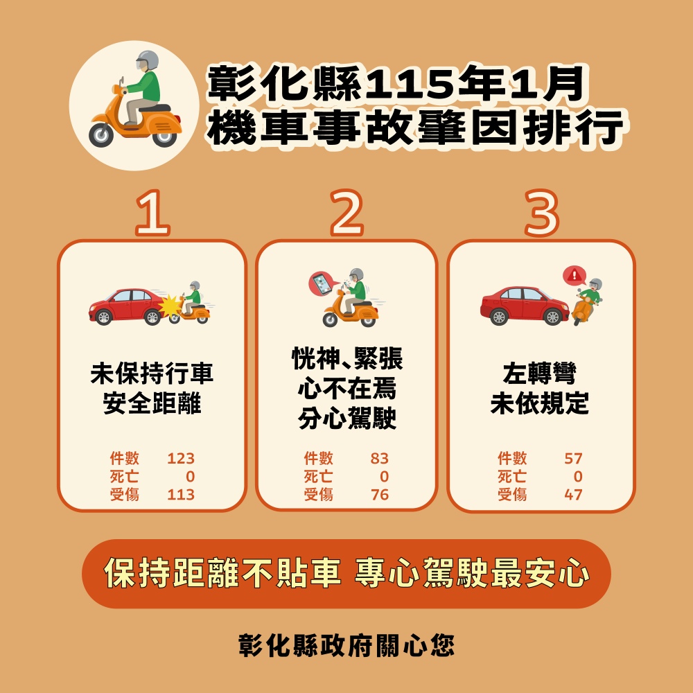 依據交通部道路安全資訊平台系統分析數據,115年1月彰化縣事故肇因排行: |